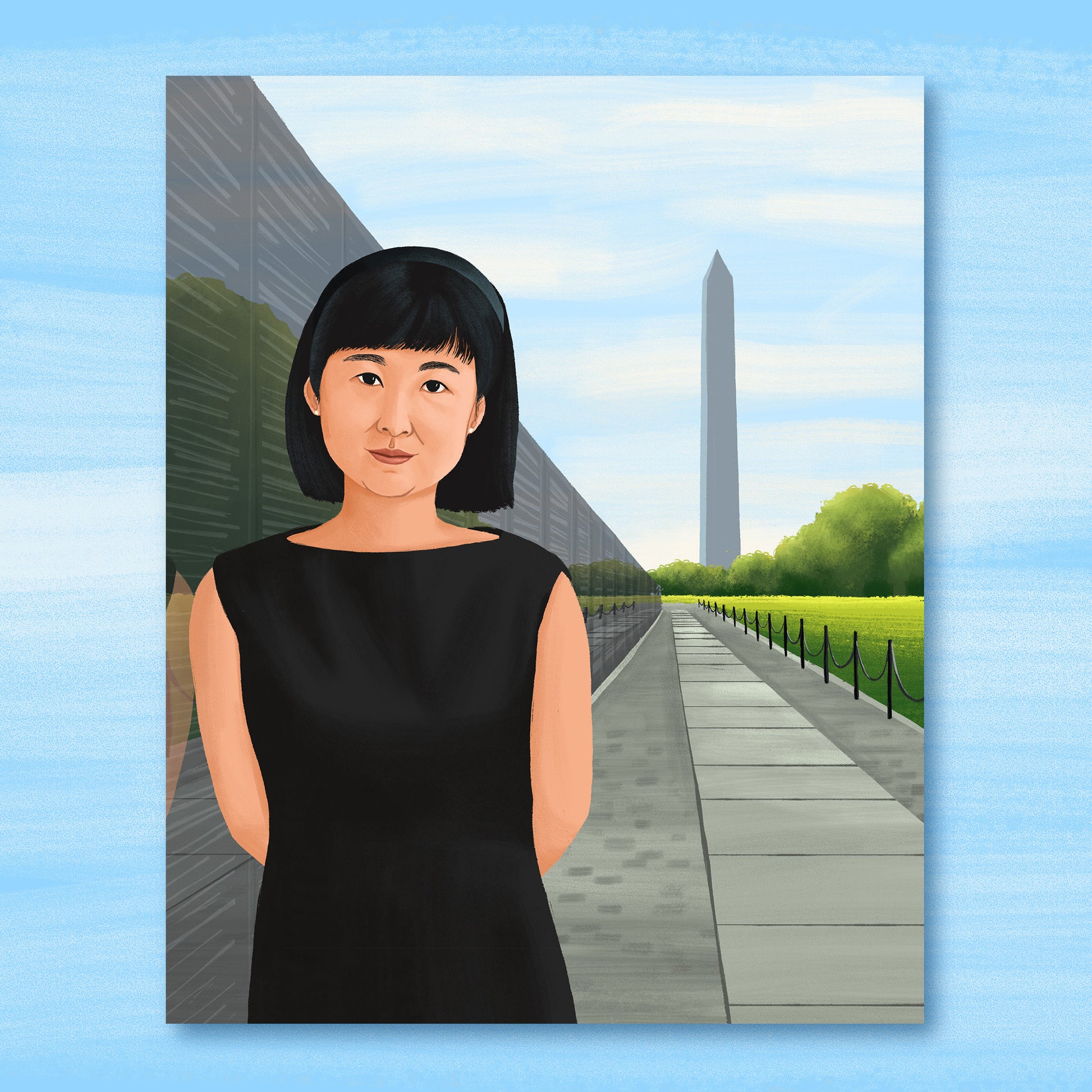 This is a print of my illustration of Maya Lin, American architect and sculptor. In 1981, at the age of 21, she won a public design competition for the Vietnam Veterans Memorial, beating over 1,000 other submissions. The graceful and abstract v-shaped granite memorial was originally seen as controversial because it was a non traditional design for a war memorial, but it has since become a popular and emotional draw for the public. More than 10,000 people view the memorial per day.